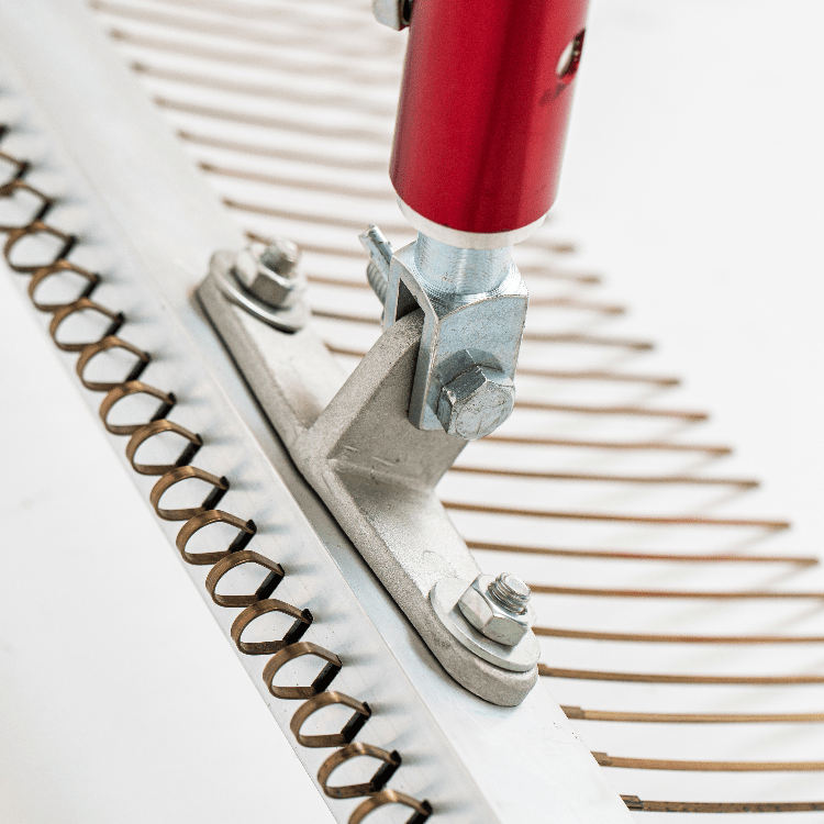 Щетка представляет собой собственно алюминиевый блок и рукоять. В алюминиевом блоке на одинаковом расстоянии друг от друга закреплены плоские отрезки из закаленной пружинной стали - зубья равной длины и ширины по 130 и 3 мм соответственно. Зубья являются сменными. Рукоять состоит из двух частей - отрезков труб равной длины по 1,8 м.п., обработанных термически для придания стойкости к коррозии, удобства использования и современного внешнего вида.