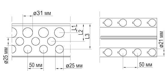 Верхний ряд отверстий рельс-форм от Т45 и более имеет увеличенный диаметр 31 мм, что существенно облегчает проникновение бетонной смеси во внутреннюю часть рельс-формы и полностью исключает образование там воздушных полостей, способных ослабить прочность бетонного основания в местах расположения рельс-форм.
